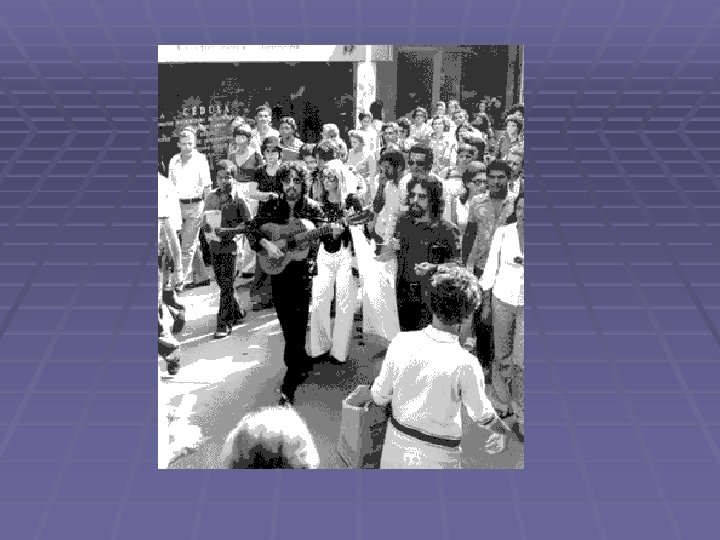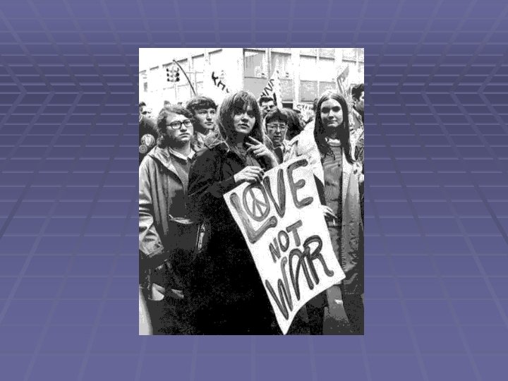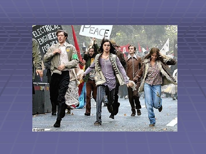 § Nos anos 60, muitos jovens passaram a contestar a sociedade e a pôr em causa os valores tradicionais, o poder militar e o poder econômico. Esses movimentos de contestação iniciaram-se nos EUA impulsionados por músicos e artistas em geral. § Os hippies defendiam o amor livre e a não -violência.