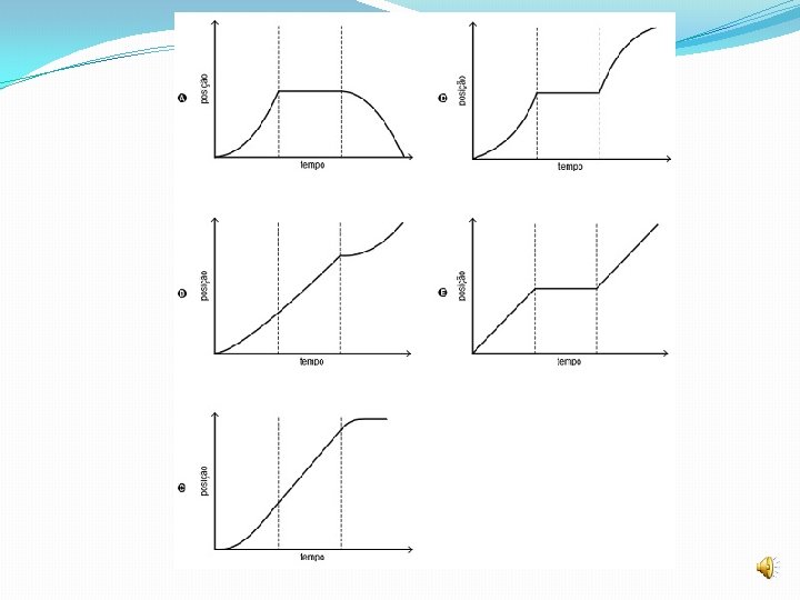 Questão 53 -2012 �Para melhorar a mobilidade urbana na rede metroviária é necessária minimizar o tempo entre estações. Para isso a administração do metrô de uma grande cidade adotou o seguinte procedimento entre duas estações: a locomotiva parte do repouso com aceleração constante por um terço do tempo de percurso, mantém a velocidade constante por outro terço e reduz sua velocidade com desaceleração constante no trecho final, até parar. Qual é o gráfico de posição (eixo vertical) em função do tempo (eixo horizontal) que representa o movimento desse trem?