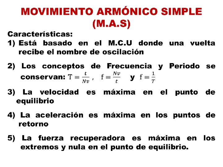FORMULAS: LEYES • • • El periodo de una masa atada a un resorte es directamente proporcional a la raíz cuadrada de la masa e inversamente proporcional a la raíz cuadrada de la constante de elasticidad del resorte El periodo de un péndulo es directamente proporcional a la raíz cuadrada de la longitud de su cuerda e inversamente proporcional a la raíz cuadrada de la gravedad del lugar donde se encuentra. El periodo de un péndulo es independiente de la masa que oscila.