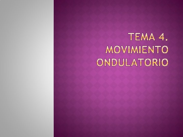 � MOVIMIENTO ONDULATORIO PROPAGACIÓN DE UNA PERTURBACIÓN REVERSIBLE QUE EXPERIMENTA UN MEDIO �CARACTERÍSTICAS: EXISTE UN TRANSPORTE DE ENERGÍA PERO NO UN TRANSPORTE NETO DE MATERIA � Hasta ahora hemos estudiado el movimiento en cuerpos materiales que se desplazan, transportando masa, momento lineal y energía cinética � Sin embargo, la energía y el momento lineal pueden viajar por el espacio sin necesidad de un cuerpo material