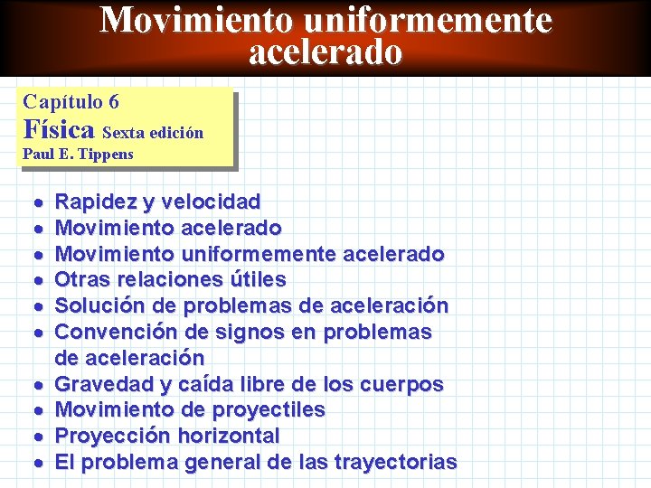 Movimiento uniformemente acelerado Capítulo 6 Física Sexta edición Paul E. Tippens · · · · · Rapidez y velocidad Movimiento acelerado Movimiento uniformemente acelerado Otras relaciones útiles Solución de problemas de aceleración Convención de signos en problemas de aceleración Gravedad y caída libre de los cuerpos Movimiento de proyectiles Proyección horizontal El problema general de las trayectorias