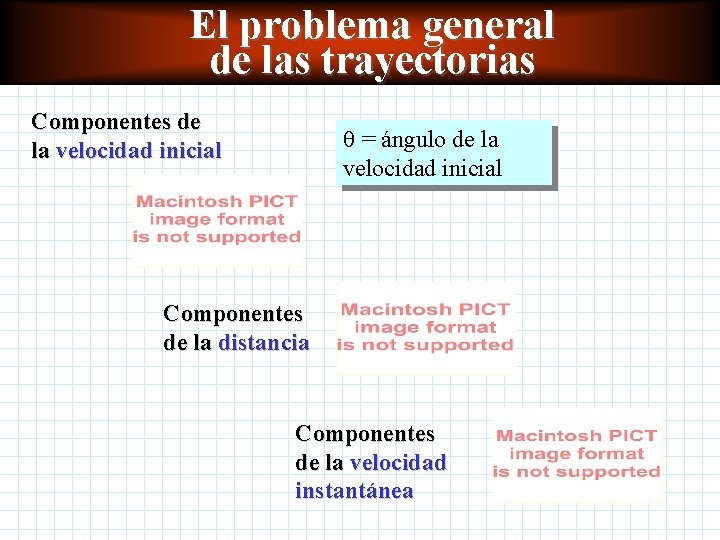 El problema general de las trayectorias Componentes de la velocidad inicial q = ángulo de la velocidad inicial Componentes de la distancia Componentes de la velocidad instantánea