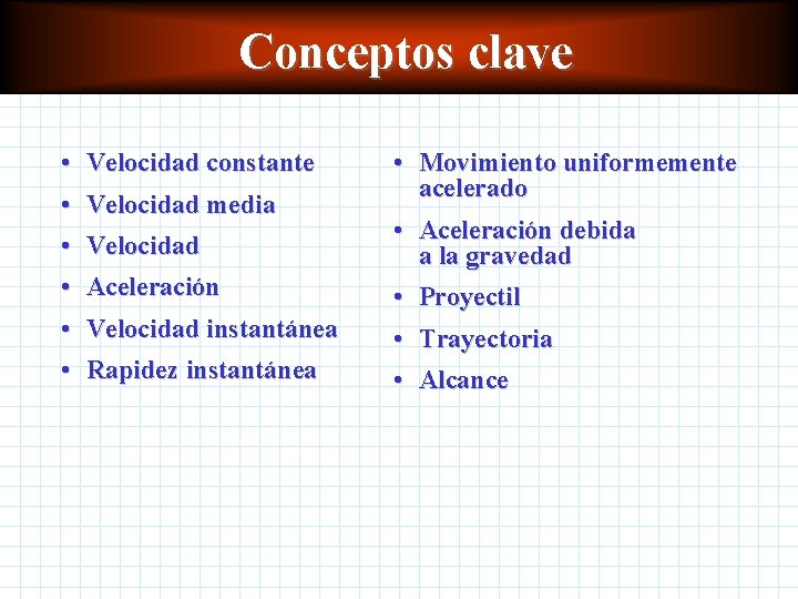Conceptos clave • Velocidad constante • Velocidad media • Velocidad • Aceleración • Velocidad instantánea • Rapidez instantánea • Movimiento uniformemente acelerado • Aceleración debida a la gravedad • Proyectil • Trayectoria • Alcance