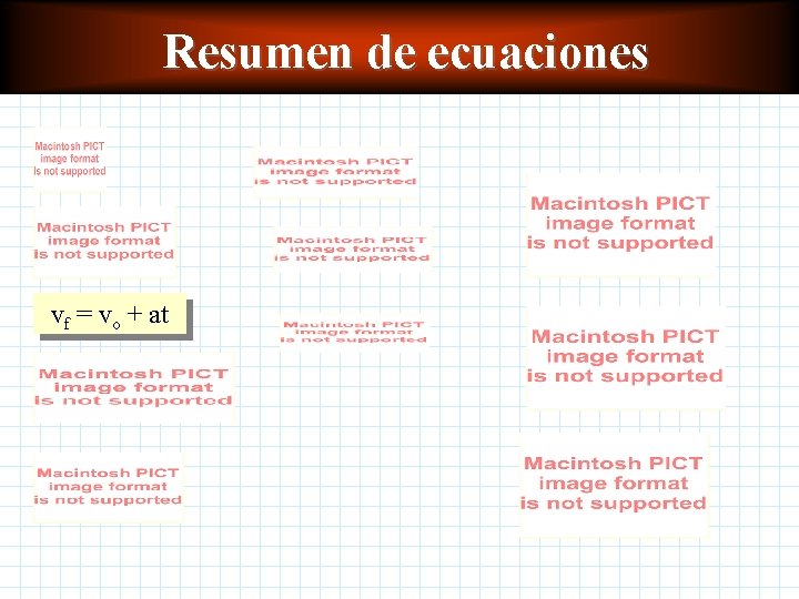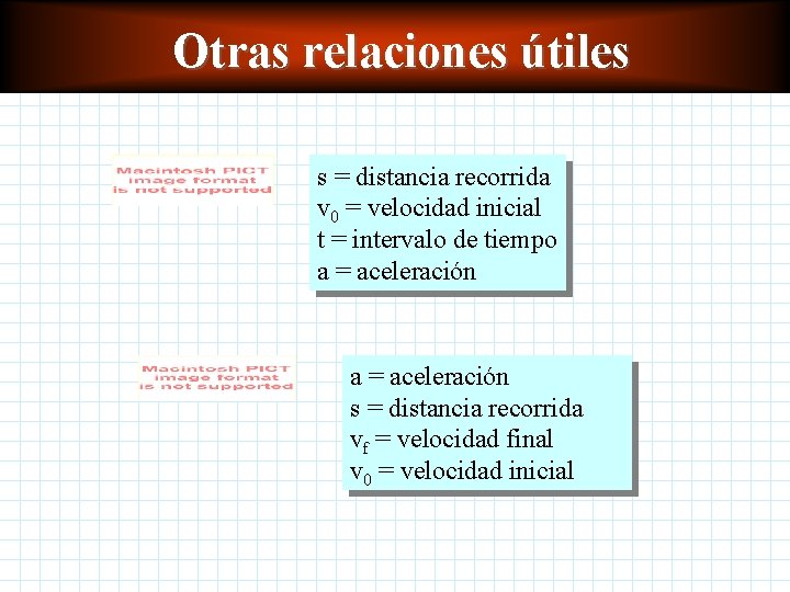 Otras relaciones útiles s = distancia recorrida v 0 = velocidad inicial t = intervalo de tiempo a = aceleración s = distancia recorrida vf = velocidad final v 0 = velocidad inicial