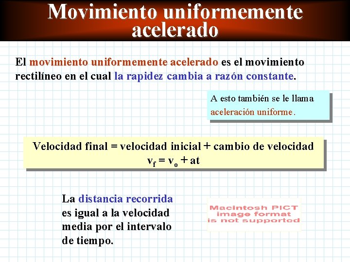 Movimiento uniformemente acelerado El movimiento uniformemente acelerado es el movimiento rectilíneo en el cual la rapidez cambia a razón constante. A esto también se le llama aceleración uniforme. Velocidad final = velocidad inicial + cambio de velocidad vf = vo + at La distancia recorrida es igual a la velocidad media por el intervalo de tiempo.