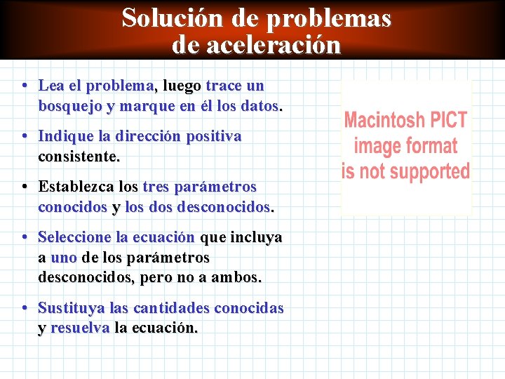 Solución de problemas de aceleración • Lea el problema, luego trace un bosquejo y marque en él los datos. • Indique la dirección positiva consistente. • Establezca los tres parámetros conocidos y los desconocidos. • Seleccione la ecuación que incluya a uno de los parámetros desconocidos, pero no a ambos. • Sustituya las cantidades conocidas y resuelva la ecuación.