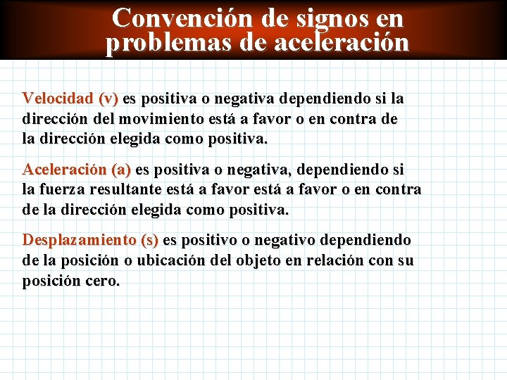 Convención de signos en problemas de aceleración Velocidad (v) es positiva o negativa dependiendo si la dirección del movimiento está a favor o en contra de la dirección elegida como positiva. Aceleración (a) es positiva o negativa, dependiendo si la fuerza resultante está a favor o en contra de la dirección elegida como positiva. Desplazamiento (s) es positivo o negativo dependiendo de la posición o ubicación del objeto en relación con su posición cero.