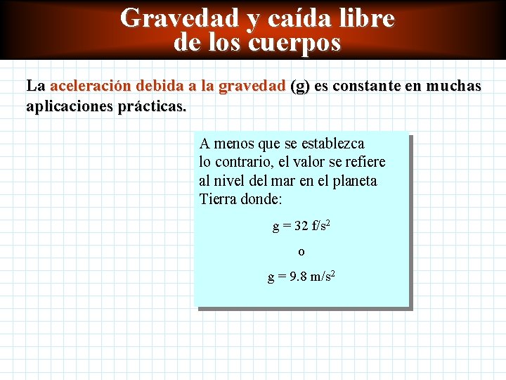 Gravedad y caída libre de los cuerpos La aceleración debida a la gravedad (g) es constante en muchas aplicaciones prácticas. A menos que se establezca lo contrario, el valor se refiere al nivel del mar en el planeta Tierra donde: g = 32 f/s 2 o g = 9. 8 m/s 2
