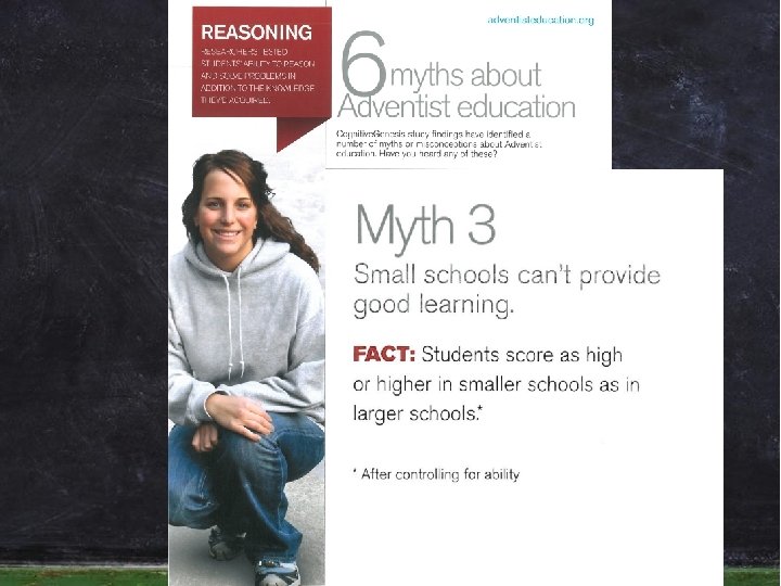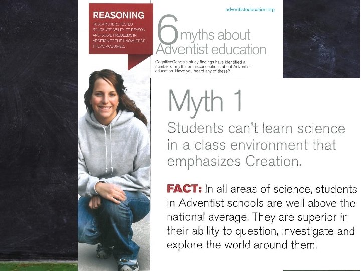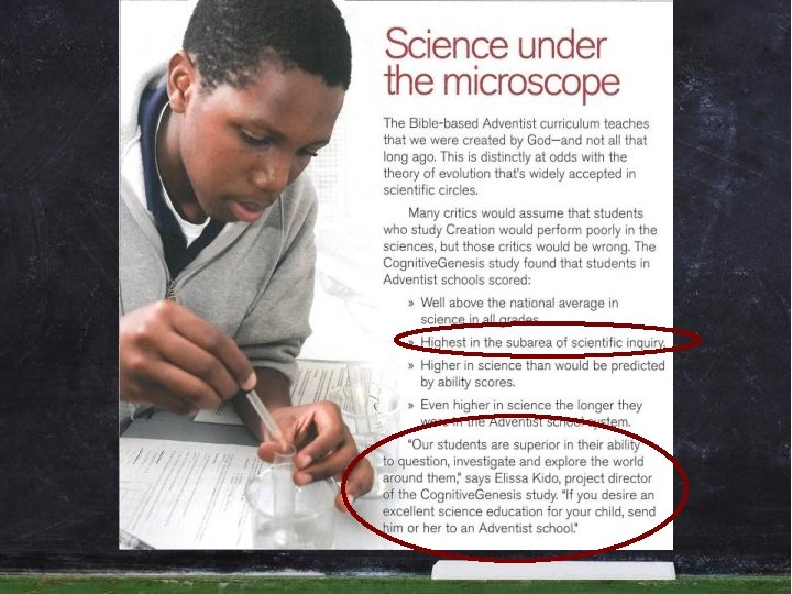 The Cognitive Genesis Study “Amid all the buzz on education reform, the Seventh Day Adventist school system might seem an unexpected place to look for models in improving student achievement. But by educating mind, body, and spirit, Adventist schools outperform the national average across all demographics. ” For real education reform, take a cue from the Adventists By Elissa Kido, Ed. D. , professor of education at La Sierra University Posted on www. csmonitor. com on November 15, 2010.