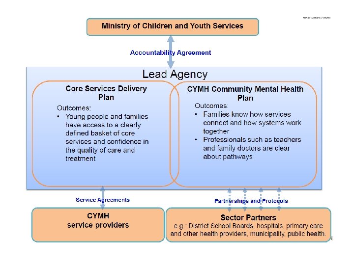 Moving on Mental Health § § MCYS produced a draft Service Framework that sets out CYMH services and processes to be funded. Eight were identified as core (available in every service area) services and two key processes. MCYS has divided the province into 34 administrative service areas. Boundaries roughly match Statistics Canada Consolidated Municipal Service Manager boundaries. Each service area will have a lead agency. Core Services: – Targeted Prevention – Brief Services – Counselling and Therapy – Family Caregiver Skill-Building and Support – Crisis Support Services – Intensive Treatment Services – Specialized Consultation and Assessments Key Processes: – Access/Intake – Service Coordination/Case Management