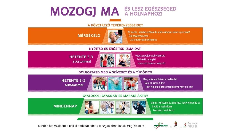 • Melyik aktivitási formát válasszuk? • Ez természetesen teljesen az egyénen múlik. Egyesek jobban szeretik az erőgya korlatokat, a küzdelmet, mások viszont inkább a kevéssé megterhelő sportokat, gyakorlatokat kedvelik. • A legfontosabb, hogy olyan mozgásfor mát válasszunk, amelyet szeretünk, és amelyben kedvünket leljük! Próbáljunk rendszeresen heti 3 5 alkalmat találni er re! Ha nem szeretjük a tornatermi mun kát vagy a futást, válasszuk a jógát. Mint minden sporttevékenység, fizikai aktivitás esetén, ilyenkor is nagyon fontos a bemelegítés és a megfelelő kellékek (ruházat, sporteszkö zök) beszerzése.