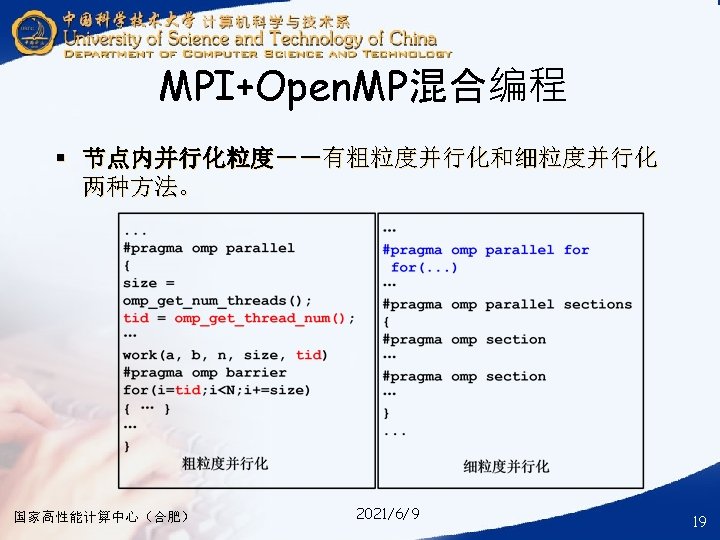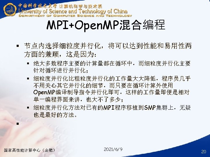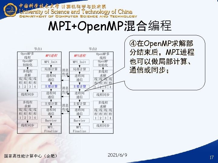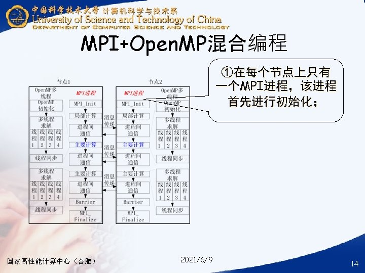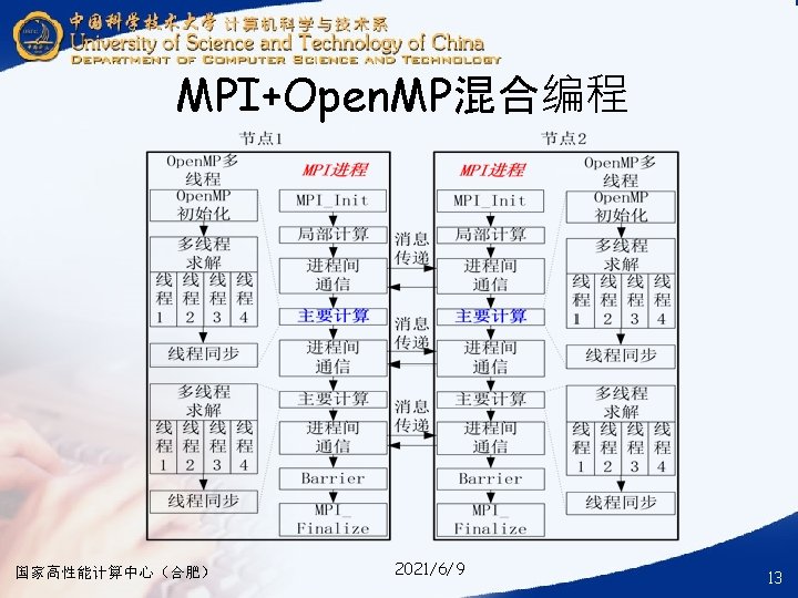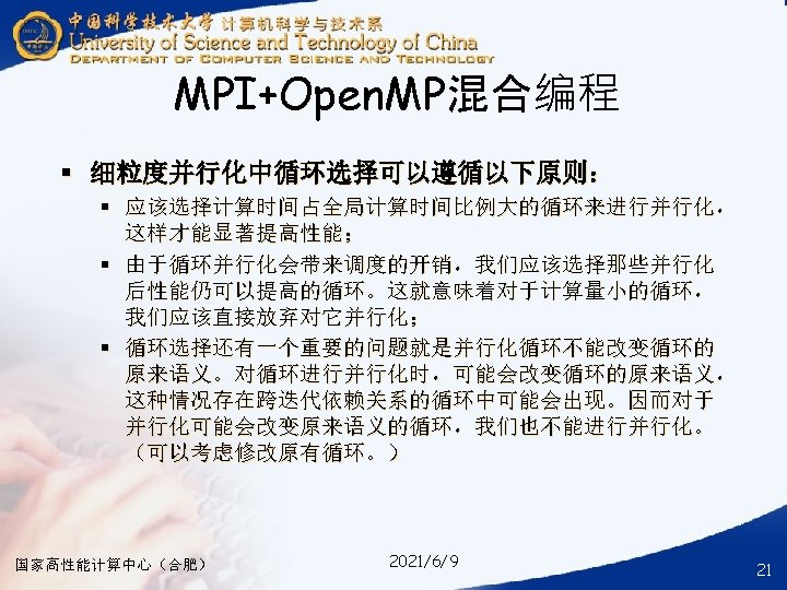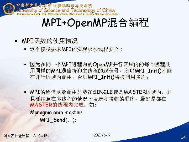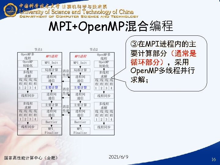 § ### for compile your hybrid program with MPI and Open. MP § mpicc -o your_mpi_omp_c_file -fopenmp your_mpi_omp_c_file. c § ### for run your hybrid program with MPI and Open. MP § mpirun -np num_of_processes -machinefile ~/ma. /your_mpi_omp_c_file 国家高性能计算中心(合肥) 2021/6/9 30