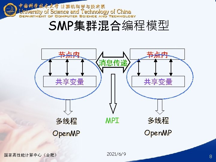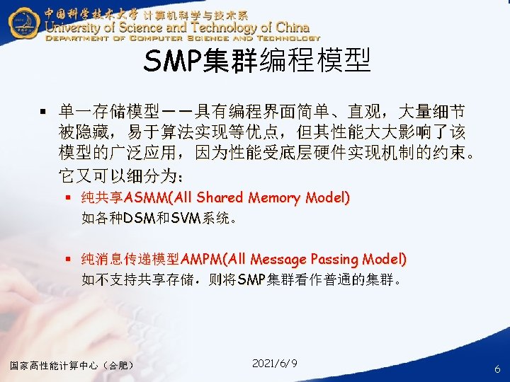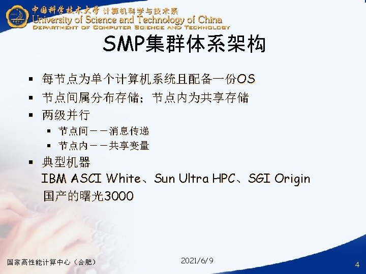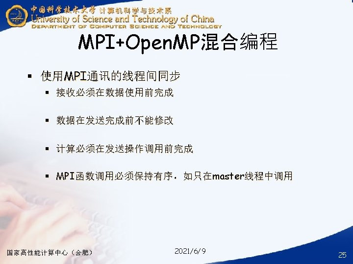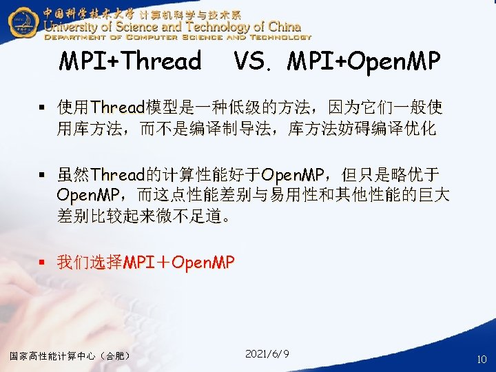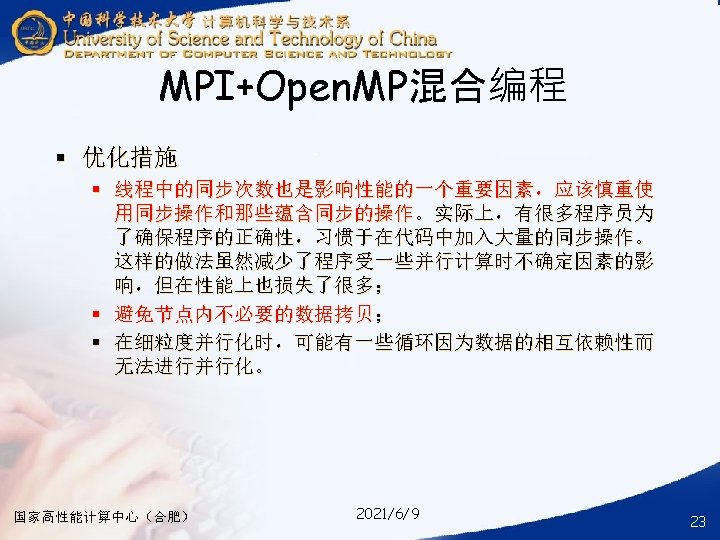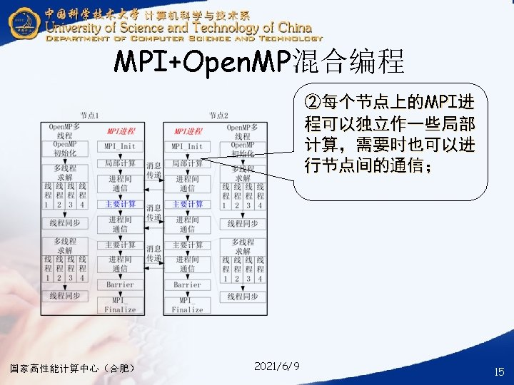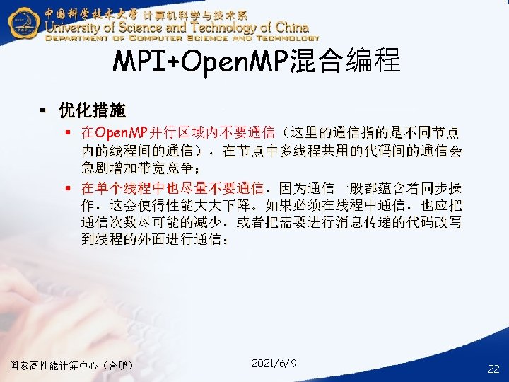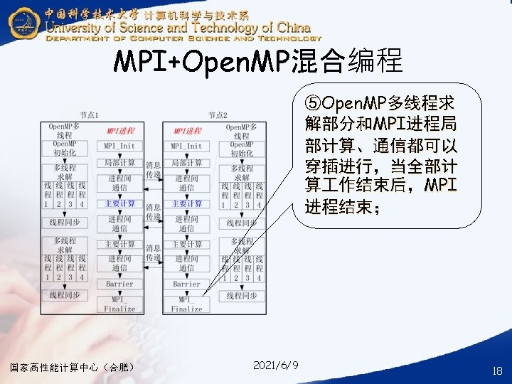 § ### for compile your hybrid program with MPI and Open. MP § mpicc -o your_mpi_omp_c_file -fopenmp your_mpi_omp_c_file. c § ### for run your hybrid program with MPI and Open. MP § mpirun -np num_of_processes -machinefile ~/ma. /your_mpi_omp_c_file 国家高性能计算中心(合肥) 2021/6/9 30