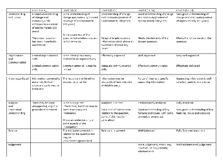 1. If possible, a quote that summarises your argument (historian? ) 2. CONTEXT What is the key debate your question concerns 3. CRITERIA (1) Definition of black civil rights OR anti-Semitism 4. CRITERIA (2) How are you going to judge whether: a) MLK was the most important factor b) Anti-Semitism under Nazi’s was an anomaly c) War had a central role d) Women were key *THIS IS YOUR THEMES + OTHER FACTORS!!!* 5. ARGUMENT What is your answer to the question
