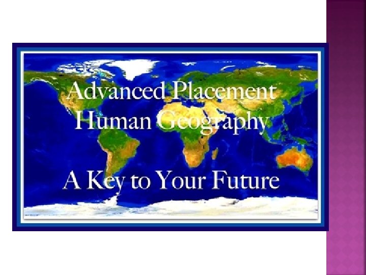 Advanced Placement Human Geography!! What is “AP Human Geography”? What are the benefits of the Advanced Placement program? When is the Advanced Placement test? Questions!? —email me or check out college board website.
