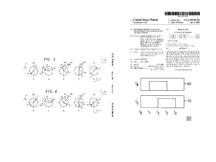 • Memory in the green area. • Read is with TMR with the magnet in the grey area, the same as before. • Write is with two perpendicular wires (bottom figure) but time dependent.