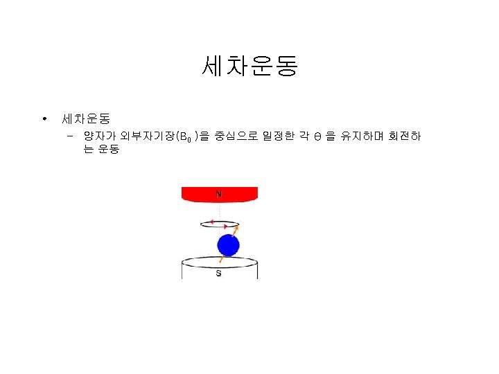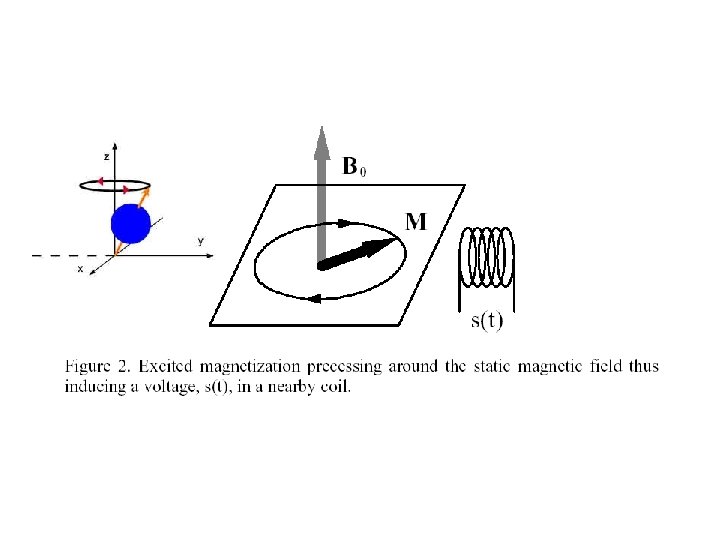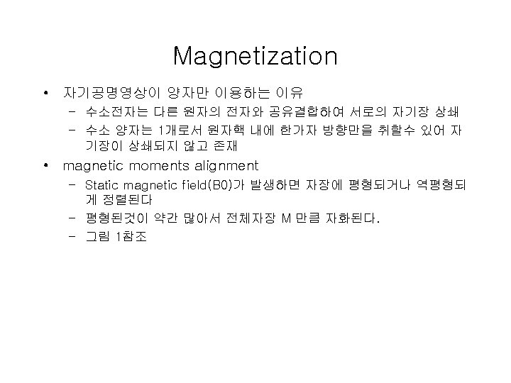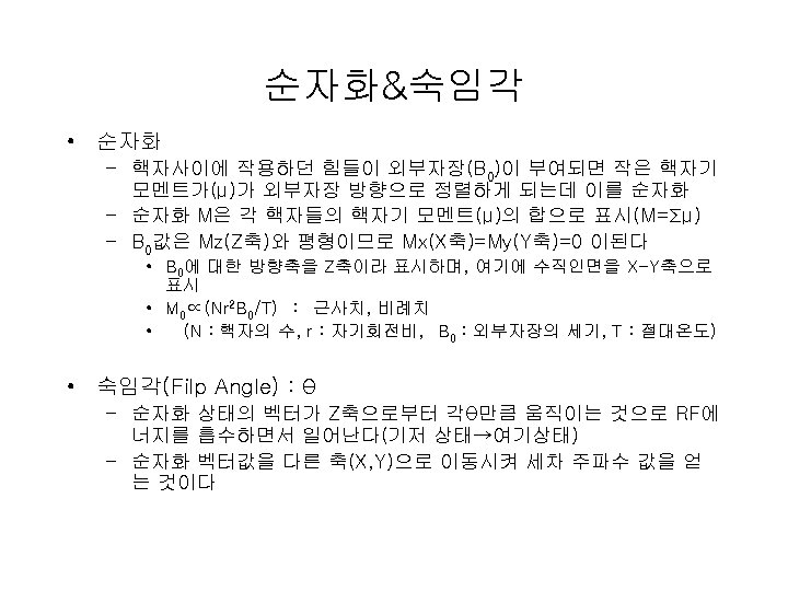 세차주파수 • 세차주파수(그림 B) – 라모어 방정식 • F=γB 0 , F(Larmor): 세차주파수(MHz), B 0 : 외부자기장(tesla), γ: 자기회전비 • γ: 자기회전비 는 nuclear 종류에 따라 결정 – 수소의 자기 회전비 : 42. 57 MHz – 라모어 방정식에서 얻어진 주파수를 걸면 Oscillating magnetic (RF) field • the spins will absorb energy and become excited: excitation – Tipping Magnetization, Induce a voltage in a nearby coil – Figure 2.