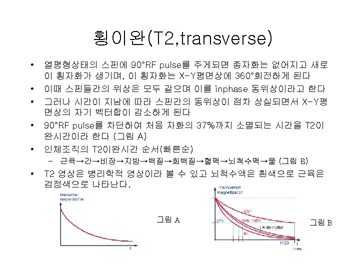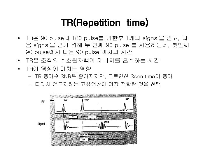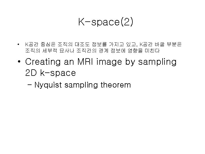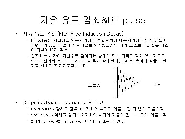 Pulse 순서 • RF pulse • Frequency encoding • Fourier transform – Magnitude of a frequency represents magnetization(induced voltage) at a specific location • Measure T 2(signal decay) and T 1(magnetization recovery)