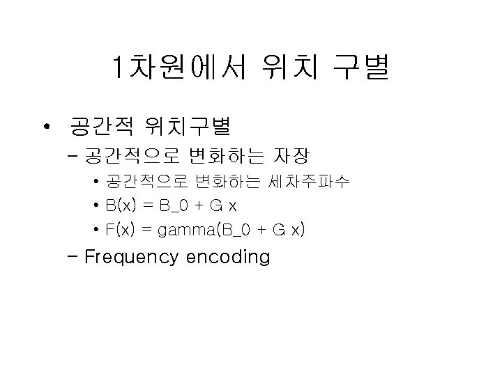 3차원 위치(slice) 구별 • Gradient in the Z-direction – Resonant frequency varying as a function of z – Resonant frequency at specific location • Moving slice location – Shifting the RF frequency up or down – Shifting the overall magnetic field up or down • Any oblique oriented slices by rotating x, y. z