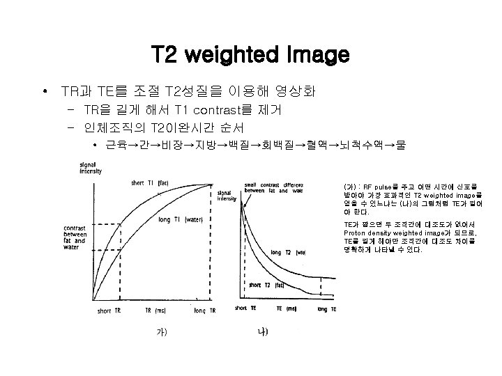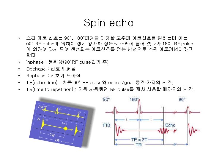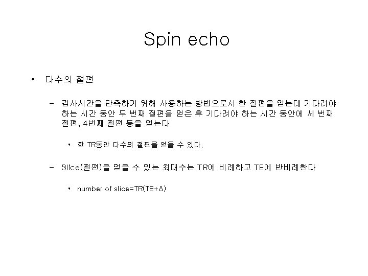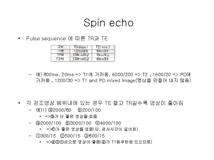 Spin echo • Spin echo영상 – T 1 weighted(T 1 강조) : TE↓, TR↓=>T 1 WI : 해부학적 영상, 검사시간 단축 – T 2 weighted(T 2강조) : TE↑, TR↑=>T 2 WI : 병리학적 영상. – Spin density weighed(Proton Density, 스핀밀도 강조, 수소밀도 강조) : TE↓, TR↑=>PDWI(=SDWI), 대조도↓ A : TR=2500, TE=15(PDW 1) B : TR=500, TE=15(T 1 W 1) C : TR=2500, TE=90(T 2 W 1)