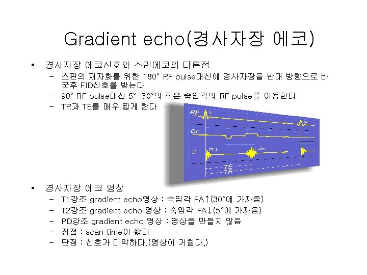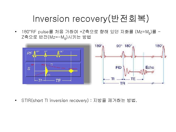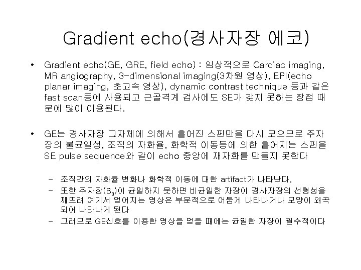 Pulse sequence • MR 영상에서 기본이 되는 4가지 pulse sequence – Partial saturation recovery(부분 포화 회복) • 신호가 미약하여 peak치 신호를 얻을 수 없어 현재는 사 용하지 않음 – Spin echo – Gradient echo – Inversion recovery
