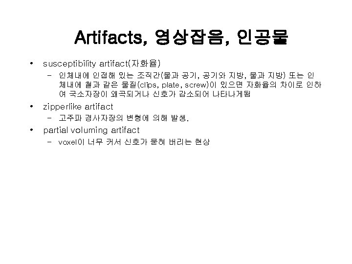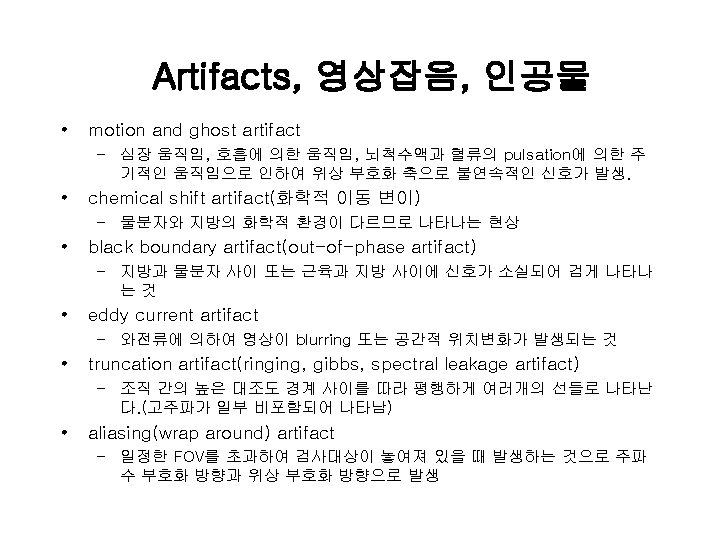 용어 해설 • 자기공명영상 : Magnetic Resonance Imaging(MRI), Nuclear Magnetic Resonance Computed Tomography, Spin Mapping, Hydrogen Mapping, Zeugmatography, Magnetic Resonance Imaging • MRS : Magnetic Resonance Spectroscopy • MRA : Magnetic Resonance Agiography • f. MRI : functional MRI