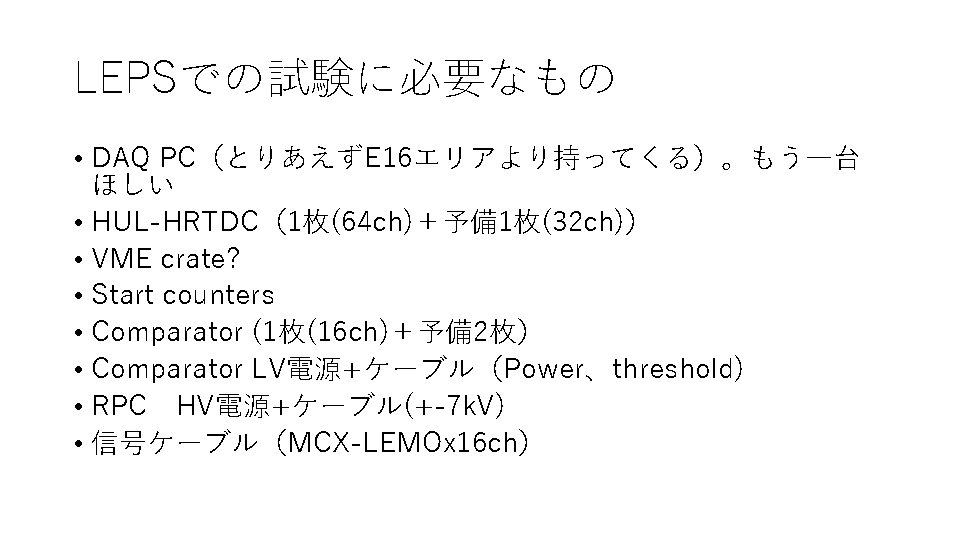 Kaon trigger at E 325 • 2 or more FTOF hits w/o associated AC hits • p>0. 4 Ge. V/c with HC-FTOF hit matrix • pion AC cutoff p<0. 5 Ge. V/c • TOF within Kaon window E 16では同様に • AC veto • TSC slat no. –MRPC strip no. , TOFを使用したtrigger でどの程度p, piをsuppressできるか?
