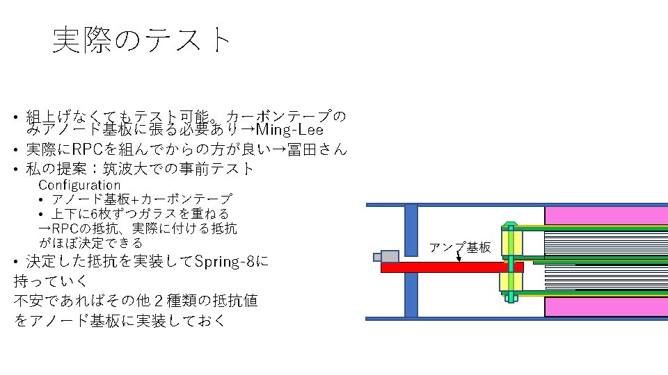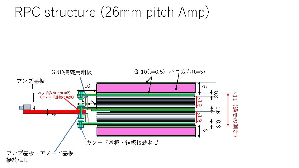 RPC断面 Honeycomb (t=5, 両側t=0. 5 G-10) 260 7 6 ~23 245 7 6 Honeycomb (t=5, 両側t=0. 5 G-10) 230 約11(ガラス+ Anode/cathod PCB) M 5 x 11? 樹脂製ねじ • 糸の張り方 56