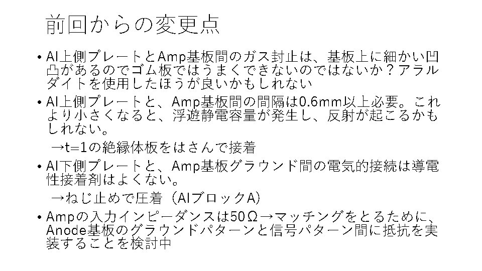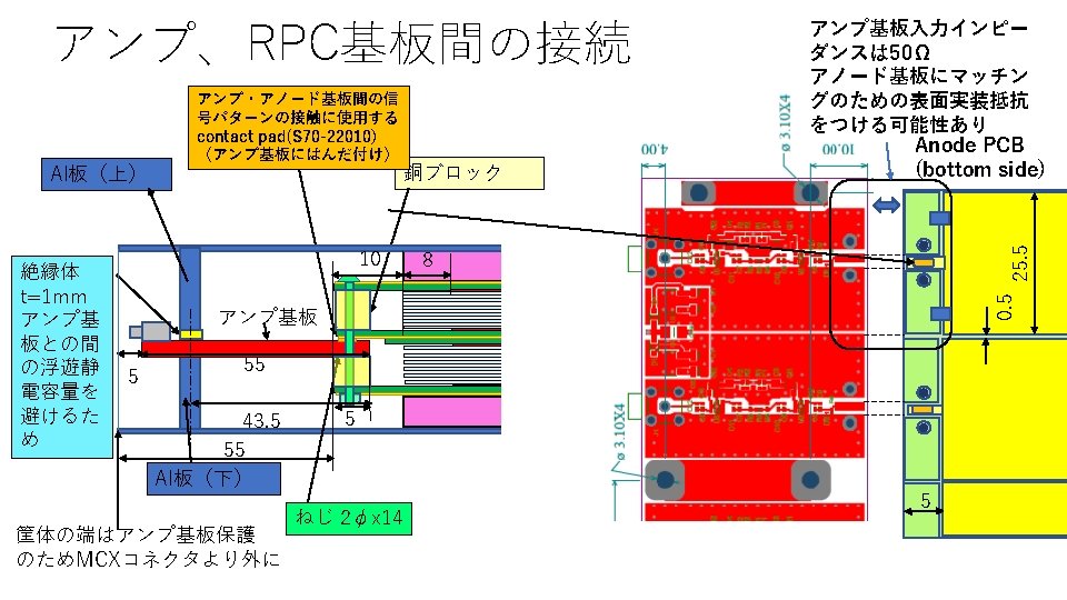 RPC structure (26 mm pitch Amp) Al chassis Connection betw. signal line of Amp PCB and RPC strip using contact pad(S 7022010) (soldered to anode PCB) Cu angle for GND connection between anode and cathode PCBs Same pattern of signal/ground as anode PCB for impedance matching (50Ω) Anode PCB (bottom side) 0. 5 25. 5 Glue for gas tightness Soldering or conductive glue between Amp PCB and chassis Amplifier PCB Screws through cathode PCBs, anode PCB, Amp PCB and Cu spacer Screw for electric contact between Amp PCB ground and Cu angle with 2. 1 mmf through holes 5
