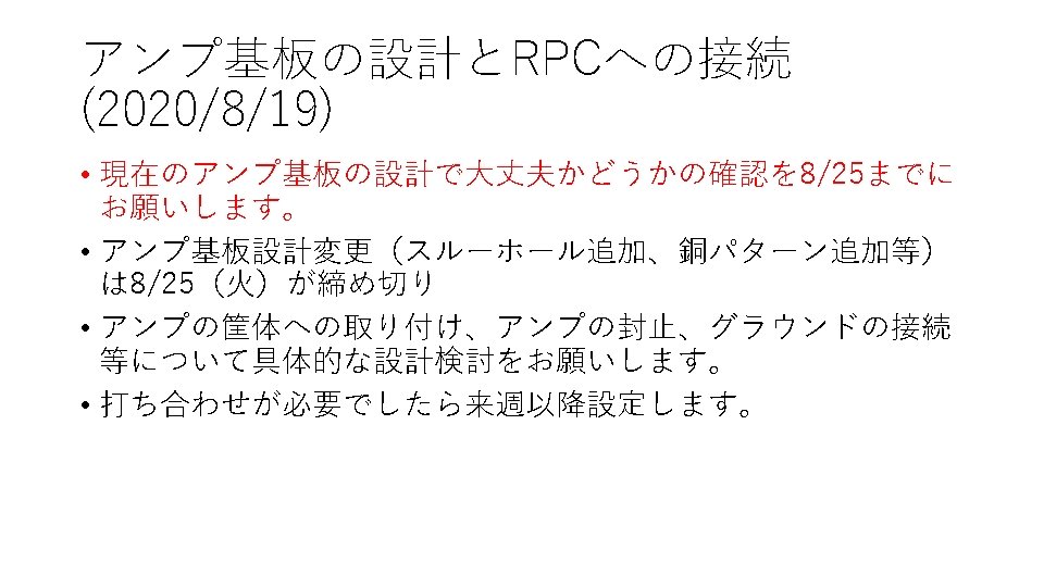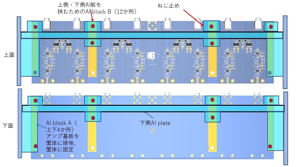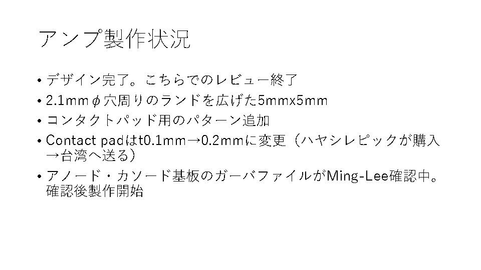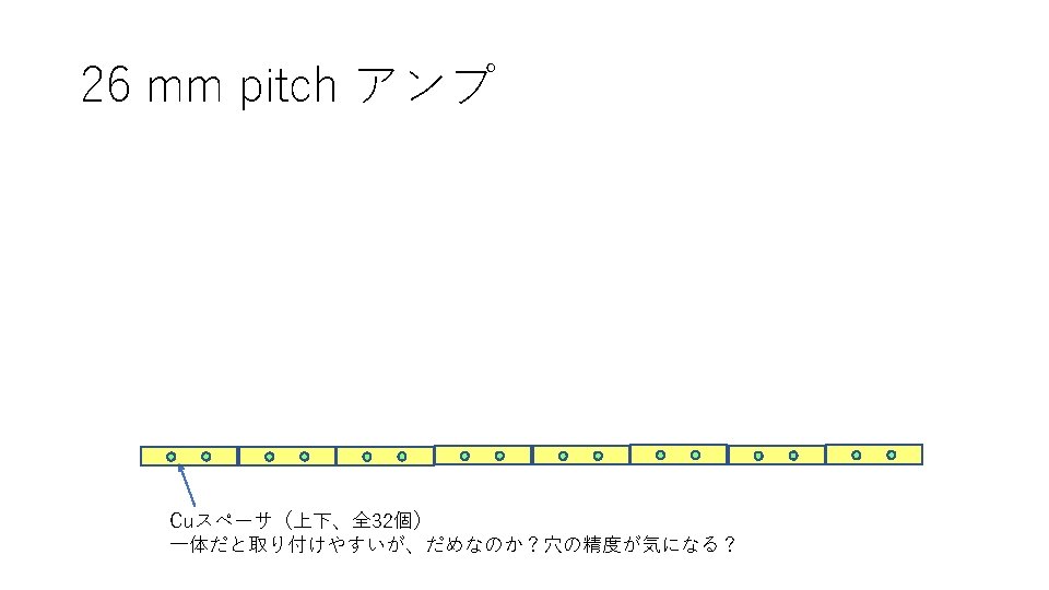 Request for 26 mm pitch amplifier 1. Make space w/o components and GND pattern in the bottom face between MCX and Lemo connector with 6 mm width Make pace w/o components In the same position in the top face 2. New 1. 1 mmf through holes for pins to determine the relative positions between the Al plates and the PCB. 3. Move two 3. 1 mmf through holes to the edge (~5 mm distance from the edge for example) 4. 5 4. Increase diameter of through holes φ1. 5 φ2. 1 Increase the distance from the center to 4. 5 mm We will not need these 4 through holes 58