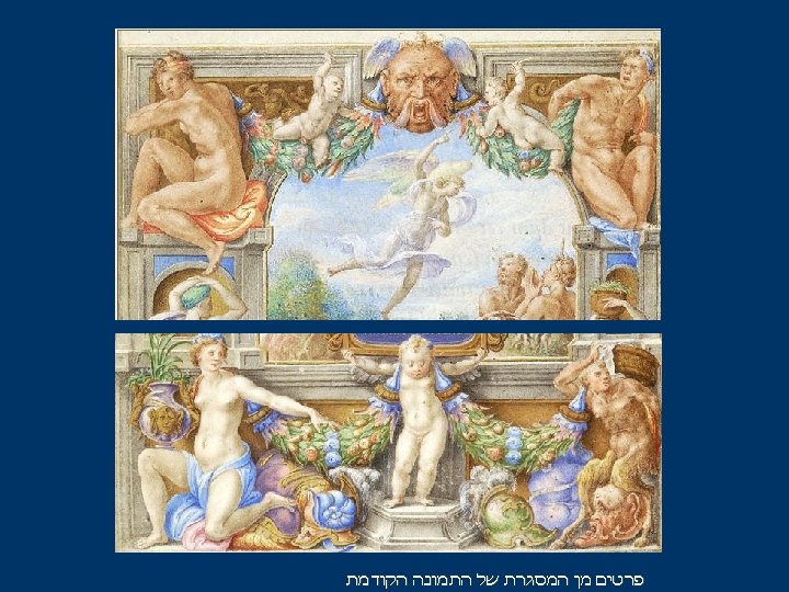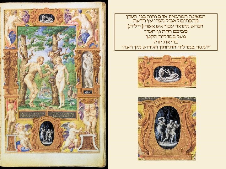 Michelangelo and Raphael appear to have been Clovio’s main sources of inspiration (Clovio’s sensuous figures recall Michelangelo’s Sistine Chapel ignudi), with Clovio’s Mannerist style also being linked to Parmigianino. וחוה אדם לתמונת המסגרת מן פרטים Details from the frame to Adam & Eve
