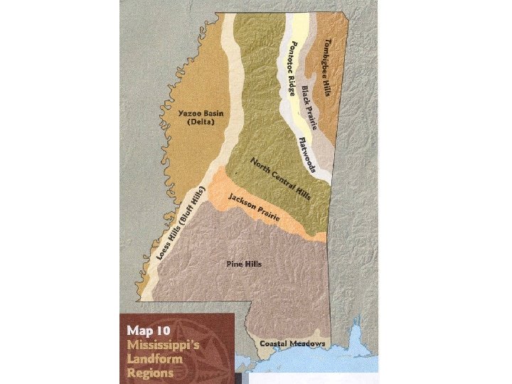 Mississippi Landform Regions MS is part of the Gulf Coastal Plain All lands in MS are fairly low elevation The highest point in MS is Woodall Mountain (806 ft above sea level) MS has 10 landform regions Tombigbee Hills Black Prairie Pontotoc Ridge Flatwoods North Central Hills Loess Hills (Bluff Hills) Yazoo Basin (Delta) Jackson Prairie Pine Hills (Piney Woods) Gulf Coastal Meadows