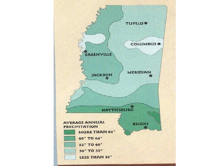 Mississippi Climate and Weather MS has a humid subtropical climate. Summers are hot and winters are cool. State is humid and has ample rainfall MS climate & rainfall helped create an agricultural state Avg. Temp. in MS is 62°F Highest Ever 115°F Lowest Ever - 19°F Avg. Precipitation is 52’’ per year 60’’ on the Gulf Coast