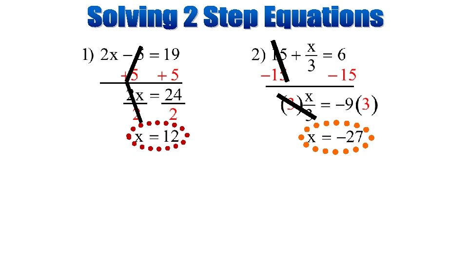Example The problem contains subtraction (-) and multiplication ( • ). Which one do we undo 1 st? -2 y – 7 = 3 +7 +7 -2 y= 10 -2 -2 y = -5