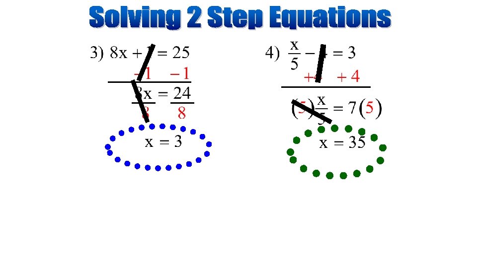 Next Step This problem has multiplication ( • ), so we need to divide (/) now. -5 x = 35 -5 -5 x = -7 Whatever we do on one side, we have to do on the other.