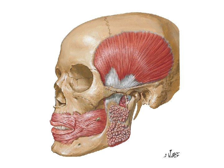 M. Masetero • Origen: Borde inferior y cara medial del arco cigomático. • Inserción: Cara lateral de la rama de la mandíbula y apófisis coronoides. • Inervación: N. Mandibular (NC V 3) a través del n. Masetero, que entra en la cara profunda • Función: Eleva y protruye la mandíbula y luego cierra los maxilares; las fibras profundas producen una retrusión mandibular. •