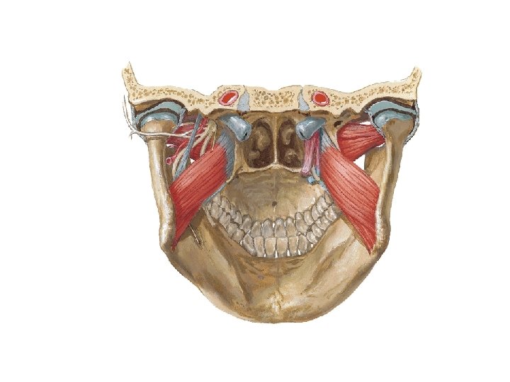 M. Pterigoideo Medial • Origen: Cabeza Profunda: Cara medial de la lámina pterigoidea lateral y apófisis piramidal del hueso palatino. Cabeza inferior: Tubérculo del maxilar. • Inserción: Cara medial de la rama de la mandíbula debajo del orificio mandibular. • Inervación: N. Mandibular a través del n. Pterigoideo medial. • Función: Cuando se contraen de manera conjunta ayudan a elevar la mandíbula y los maxilares; cuando actúan por separado protruyen el lado maxilar y cuando lo hacen de manera alterna determinan un movimiento de trituración.