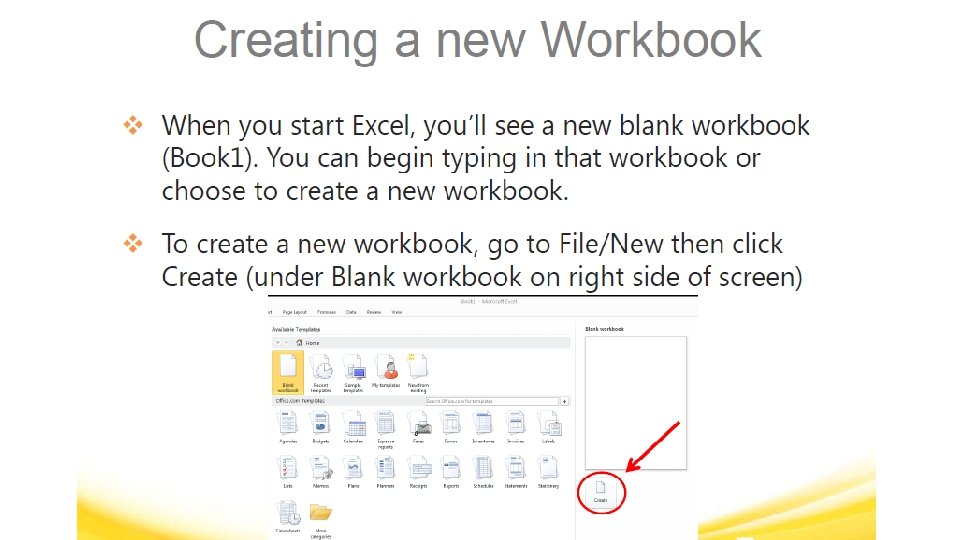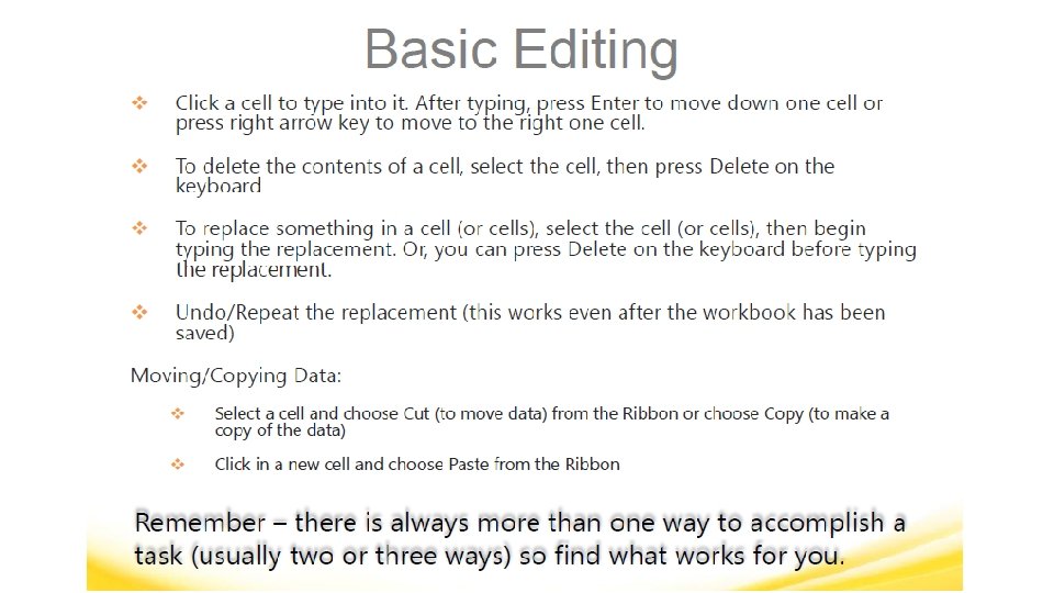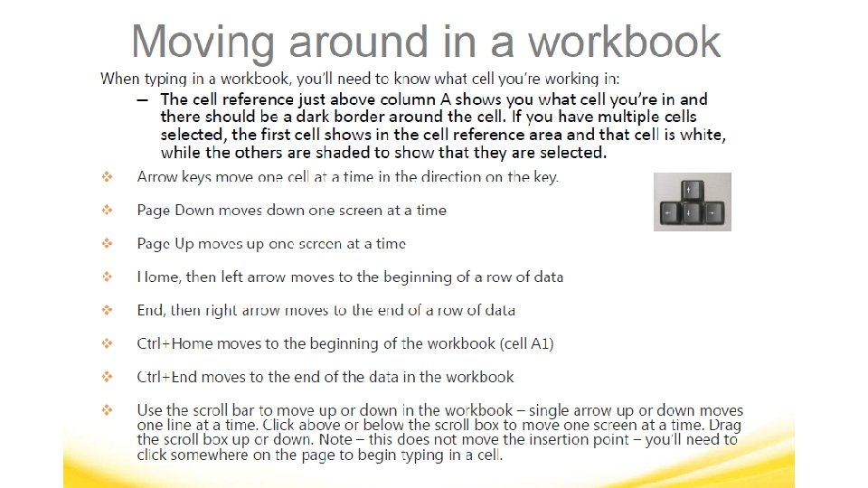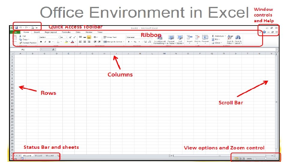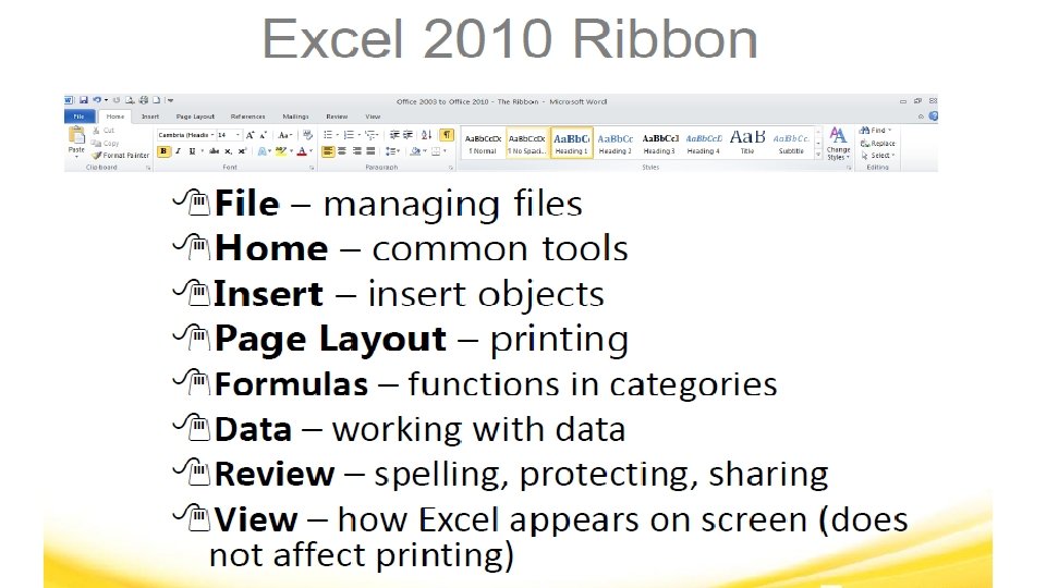 MICROSOFT EXCEL VOCABULARY WORDS § Headings – The identifying letters and numbers for columns and rows. Columns are identified with letters, rows with numbers. § Label – The identifying name that reflects the information contained in a column or row in a worksheet, such as name or date. § Row – In a worksheet, the horizontal spaces with the headings 1, 2, 3, and so on. § Sheet Tabs – Tabs you see at the bottom of your workbook file, labeled Sheet 1, Sheet 2, and so on. You can rename the tabs.