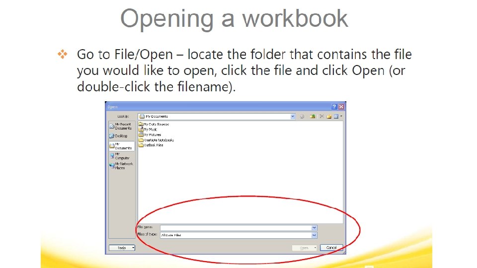 MICROSOFT EXCEL VOCABULARY WORDS § File – A document that is stored on your computer. In Excel, a file is also known as a workbook. § Fill Down – A feature that allows you to copy information in an active cell to another cell or range of cells selected vertically. § Fill Right – A feature that allows you to copy information in an active cell to another cell or range of cells you have selected horizontally.