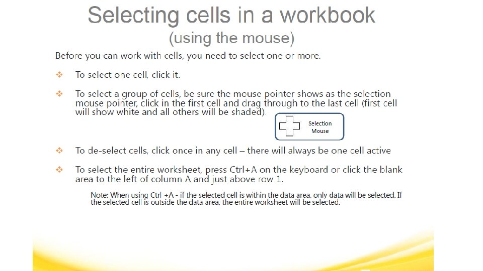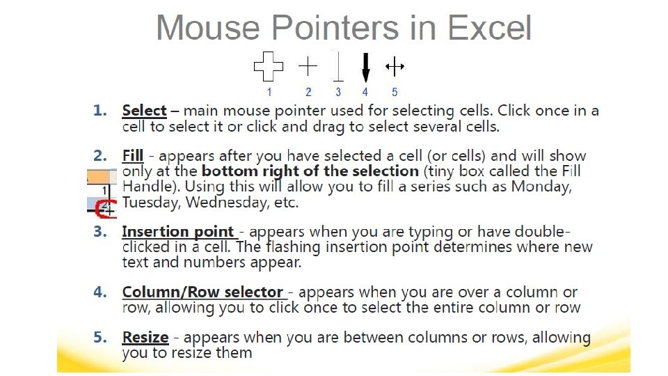 MICROSOFT EXCEL VOCABULARY WORDS § Cell Address – The name of the cell is determined by the name of the row and the column intersecting, such as A 8. § Cell Grid – The lines on your worksheet that separate the columns and rows. § Column – In a worksheet, the vertical spaces with headings A, B, C, and so on. § Drag – When you move the mouse while holding down the mouse button (usually the left) to select a range of cells.