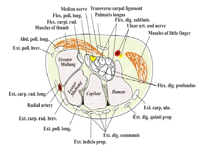 Surgical Procedures • In carpal tunnel release surgery, the goal is to divide the transverse carpal ligament in two. • This is a wide ligament that runs across the hand, from the scaphoid bone to the hamate bone and pisiform. It forms the roof of the carpal tunnel, and when the surgeon cuts across it (i. e. , in a line with the ring finger) it no longer presses down on the nerve inside, relieving the pressure. • Endoscopic surgery is also useful