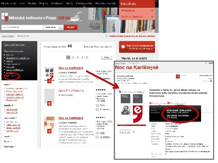 Zpřístupňování § ve dvou rovinách: § katalog § E-KNIHA samostatný záznam v katalogu na úrovni vyjádření § speciální stránky, sdružuje rozcestník www. e-knihovna. cz § § e-knihy v 7 formátech informace o projektu – spolupracující subjekty zajímavosti – seznamy knih, CD nebo kazet z fondu MKP, besedy přidaná hodnota: komiks Sherlock Holmes z Čtyřlístku, pohádkové omalovánky § v online katalogu se od roku 2011 e-kniha zobrazí jako další výsledek při hledání