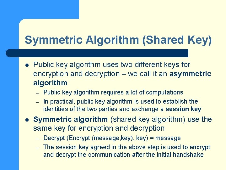 Symmetric Algorithm (Shared Key) l Public key algorithm uses two different keys for encryption and decryption – we call it an asymmetric algorithm – – l Public key algorithm requires a lot of computations In practical, public key algorithm is used to establish the identities of the two parties and exchange a session key Symmetric algorithm (shared key algorithm) use the same key for encryption and decryption – – Decrypt (Encrypt (message, key) = message The session key agreed in the above step is used to encrypt and decrypt the communication after the initial handshake