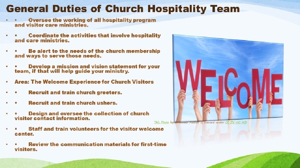 Responsibilities of the Position • The coordinator will pay attention to the hopes, concerns, and needs of people for healthcare in the community (including the congregation) to determine how the congregation might serve these people, especially those with disabilities and/or limited resources. • The coordinator will lead planning and implementation of a comprehensive health and welfare ministry program to align with the overall goals of the congregation.