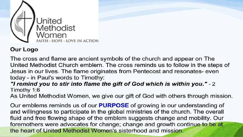 • • United Methodist Women is the largest denominational faith organization for women with approximately 800, 000 members whose mission is fostering spiritual growth, developing leaders and advocating for justice. The Vision of United Methodist Women Turning faith, hope and love into action on behalf of women, children and youth around the world. • Living the Vision • Members raise up to $20 million each year for programs and projects related to women, children and youth in the United States and in more than 100 countries around the world. • We provide opportunities and resources to grow spiritually, become more deeply rooted in Christ and put faith into action. • United Methodist Women and The United Methodist Church's principles and values include: • • Promoting the empowerment of women, children and youth. We are organized for growth, with flexible structures leading to effective witness and action. • We equip women and girls around the world to be leaders in communities, agencies, workplaces, governments and churches. • We work for justice through compassionate service and advocacy to change unfair policies and systems. • We provide educational experiences that lead to personal change in order to transform the world. • Promoting anti-racism and multiculturalism. • Promoting inclusion and equity. • Promoting fair labor practices. • Promoting economic and environmental stewardship and sustainability.