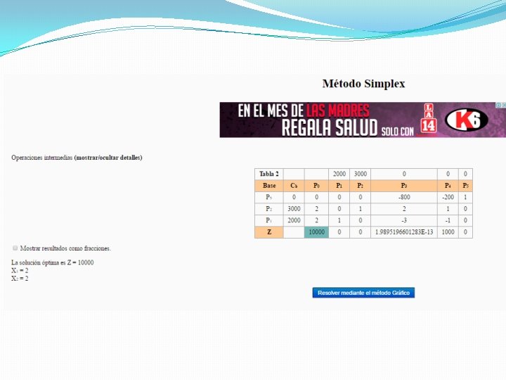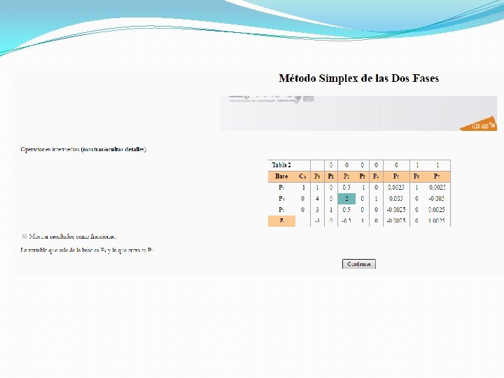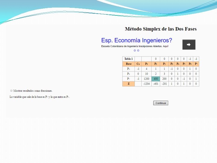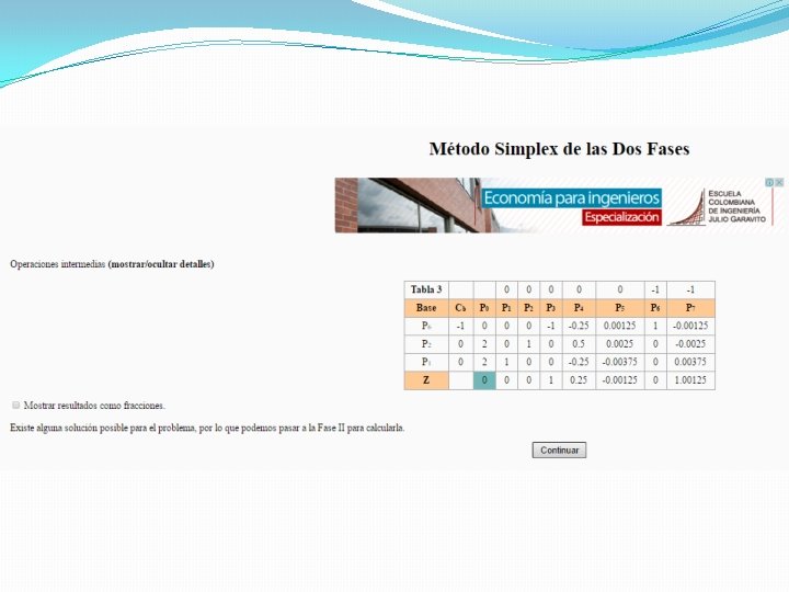 Fase 2 (Resolvemos el modelo con la nueva solución encontrada): �Eliminamos las variables artificiales de las restricciones, pero conservamos los cambios que se dieron durante la fase 1. �Regresamos a la función objetivo original y resolvemos el modelo con los cambios que se dieron en las restricciones durante la fase 1.