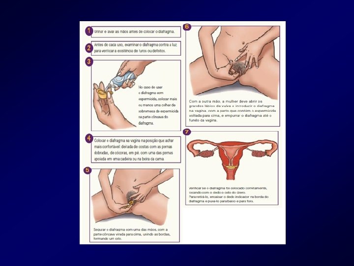 Diafragma Veda a passagem dos espermatozoides para o útero, evitando a fecundação.
