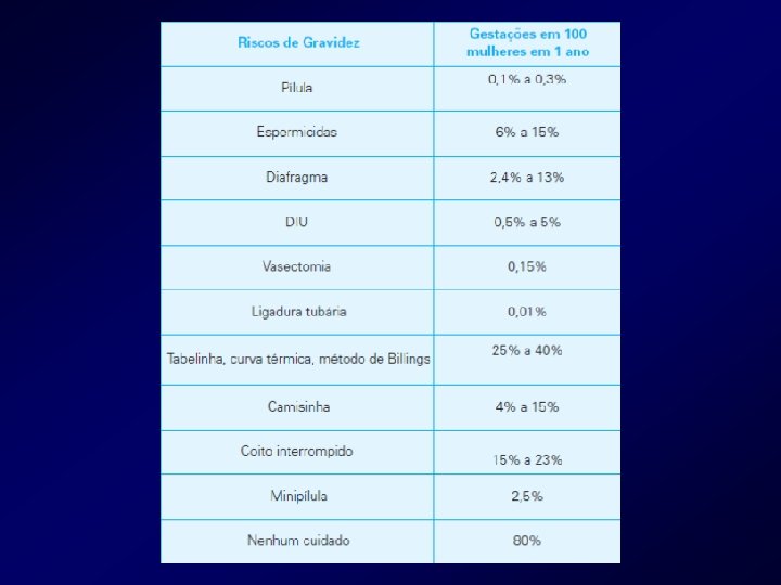Espermicidas • Espermicidas químicos: nonoxinol-9, menfegol e cloreto de benzalcônio. • Os espermicidas matam os espermatozóides ou impedem seu movimento até o óvulo. • A eficácia depende do uso do espermicida de forma correta, todas as vezes em que a mulher tenha uma relação sexual.