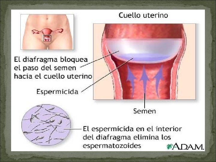 �El diafragma: Es una caperuza o casquete de látex muy flexible que se coloca en el fondo de la vagina, cubriendo completamente el cuello del útero. �Impide el paso de los espermatozoides al interior del útero, al tapar el cuello del útero que es el principal punto de paso.