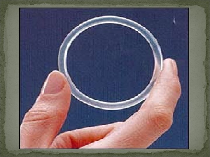 �Anillo vaginal: Un aro de un material similar al plástico de 5 cm. de diámetro y 4 mm de grosor contiene las hormonas similares a las de la píldora anticonceptiva; a través de unos pequeños poros en el anillo se va soltando el medicamento que es absorbido por la mucosa de la vagina. �Se introduce en la vagina, como un tampón, a los 5 -7 días de empezar el ciclo, dejándolo dentro durante 21 días; pasado este tiempo se retira, se deja 7 días de descanso y se inserta otro nuevo.